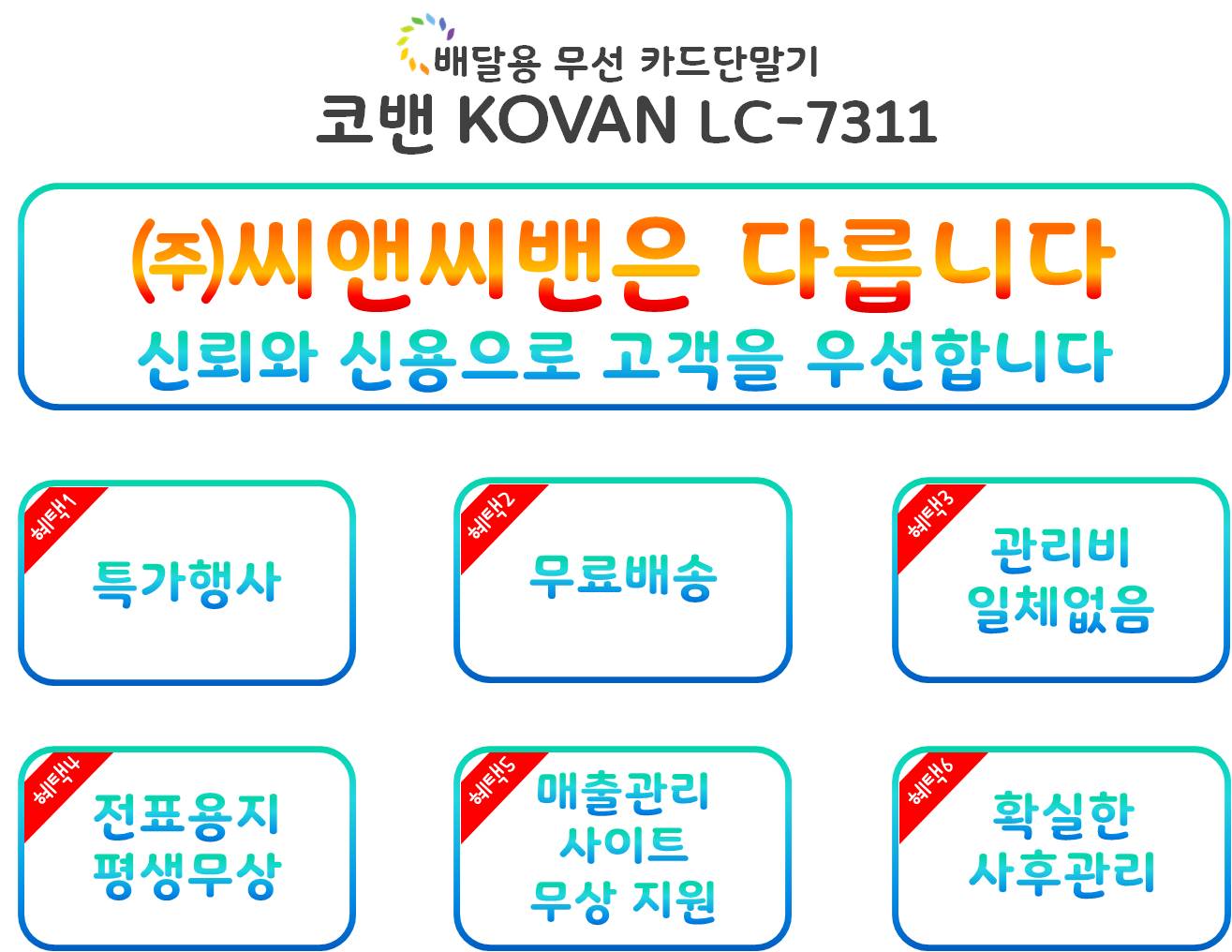 | 교환 및 반품이 가능한 경우 | 상품등을 실제 받으신 날로부터 7일 이내. (※ 포장을 개봉하여 사용하거나 또는 설치완료가 되어 상품등의 가치가 훼손된 경우에는 반품 및 교환이 불가하오니 이점 양해하여 주시기 바랍니다. 단, 상품등의 내용을 확인하기 위하여 포장을 개봉한 경우에는 교환 및 반품이 가능합니다.) 받으신 상품의 내용이 표시 사항과 다른 경우(판매자 귀책사유)에는 상품을 받으신 날로 부터 3개월 이내 「전자상거래등에서의소비자보호에관한법률」에 규정되어 있는 소비자 청약철회 가능범위에 해당되는 경우. 기타, 고객님의 단순한 변심에 의해 상품의 교환 및 반품을 요청하시는 경우에는 고객님께서 상품 반송에 소요되는 비용을 실비로 부담하셔야 하오니 이점 양해하여 주시기 바랍니다. (※ 제품이상 및 주문 확인실수의 경우 - 배송비 (주)씨앤씨밴 부담 제품하자 아닌 고객 주문실수 및 단순변심인 경우 - 입 / 출고 배송비 : 고객부담) |
